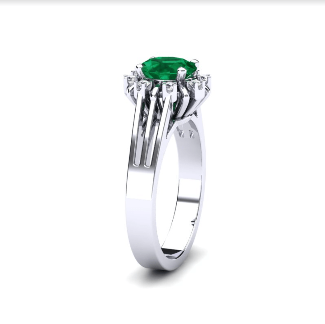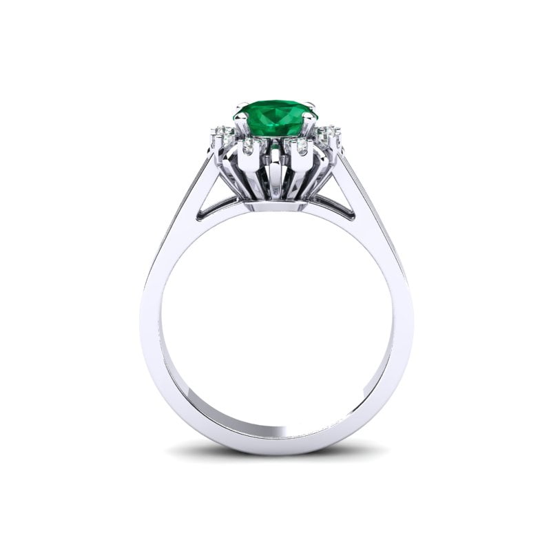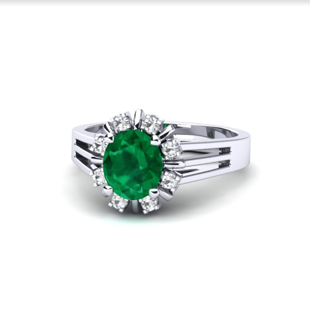 Očaravajući prsten od belog zlata sa dominantnim smaragdom i dijamantima predstavlja vrhunac sofisticiranosti i luksuza. U središtu prstena dominira zapanjujući smaragd, čija duboka zelena nijansa donosi eleganciju i sofisticiranost dizajnu. Ovaj prelep ovalni smaragd pruža bogatu boju i spektakularan sjaj, stvarajući očaravajući vizuelni fokus. Savršen za one koji žele da se istaknu sa elegantnim i prefinjenim komadom, ovaj prsten nudi nezaboravan vizuelni dojam i bezvremensku lepotu.