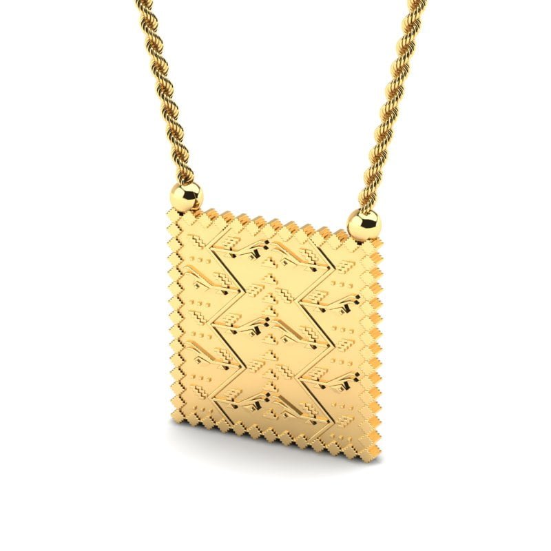 Ogrlica od zlata Skverče sa moćnim ornamentima inspirisanim pirotskim ćilimima predstavlja jedinstven komad nakita vrhunske izrade. Ovi motivi, ukorenjeni u srpskoj tradiciji, štite svog nosioca od negativnih uticaja i privlače pozitivnu energiju.