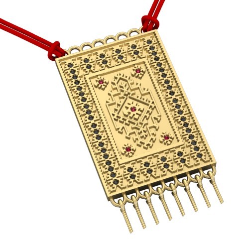 Zlatna ogrlica u obliku ćilima predstavlja spoj tradicije i sofisticirane elegancije. Inspirisana je bogatim motivima i živopisnim šarama pirotskih ćilima. Ovi ornamenti nose snažnu simboliku i dugu istoriju. Poznati su po vrhunskoj veštini izrade.