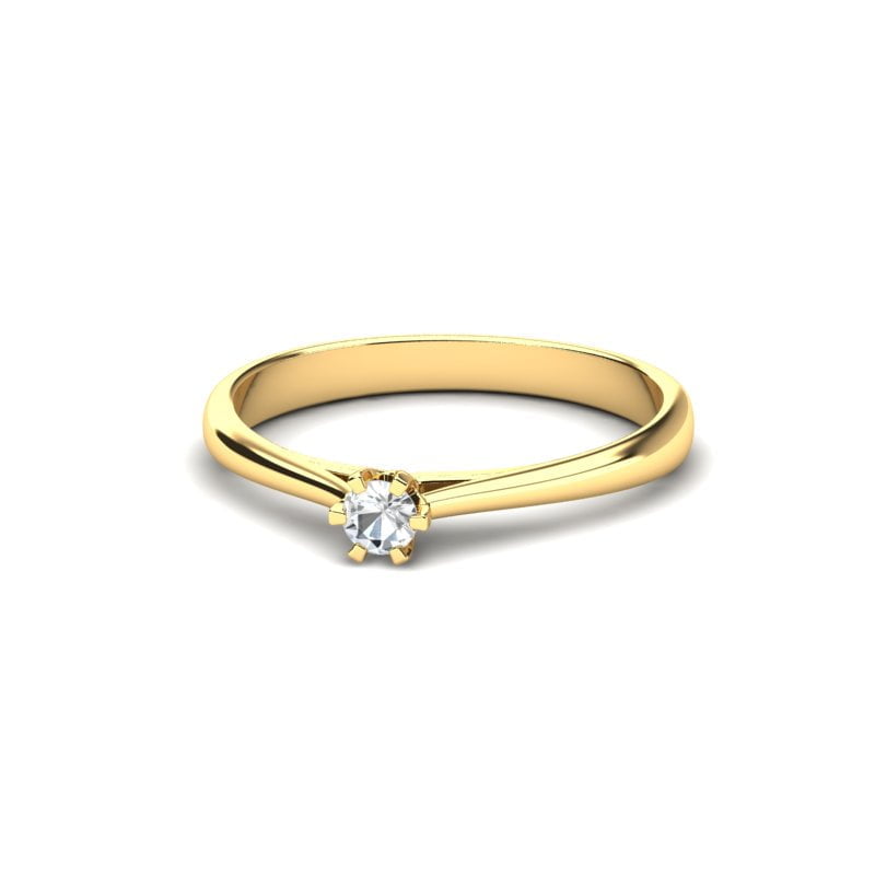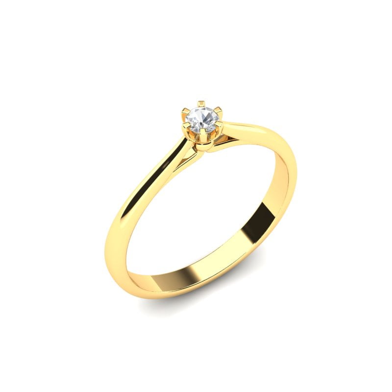 Sveden, ali dopadljiv verenički prsten od žutog zlata sa autentičnim brilijantom vrhunskog kvaliteta. Ovaj nežni verenički prsten odiše sofisticiranošću i elegancijom. U središtu prstena smešten je blistavi dijamant, čiji sjaj je savršeno istaknut zahvaljujući šest delikatnih krapnica koje ga pažljivo drže. Krapnice su dizajnirane tako da diskretno obuhvataju dijamant, omogućujući mu da zasija u punom svetlu. Istovremeno omogućavaju da prsten zadrži suptilnu i elegantnu estetiku. Ovaj prsten je pravi simbol večne ljubavi i posvećenosti. Savršen za one koji žele da svoju veridbu obeleže jedinstvenim komadom nakita koji je istovremeno elegantan, ali i pun emotivnog značaja.
