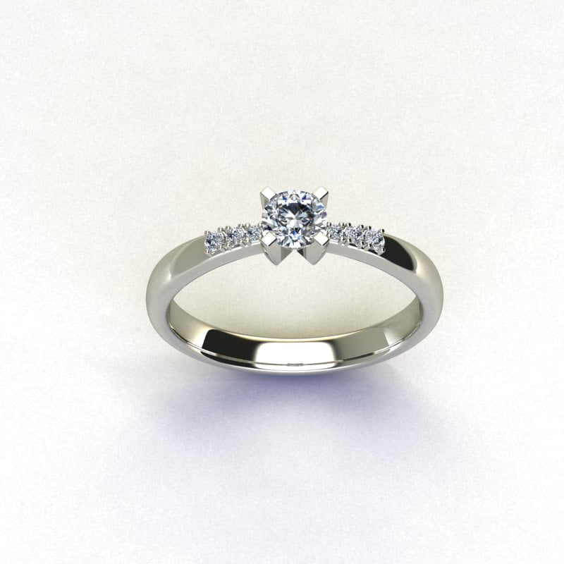 Brilijanti su precizno postavljeni, stvarajući savršenu ravnotežu između centralnog kamena i okolnih dijamanata. Belo zlato, sa svojom hladnom i modernom površinom, daje prstenu čist i sofisticiran izgled, čineći ga savršenim simbolom trajne ljubavi i posvećenosti.
