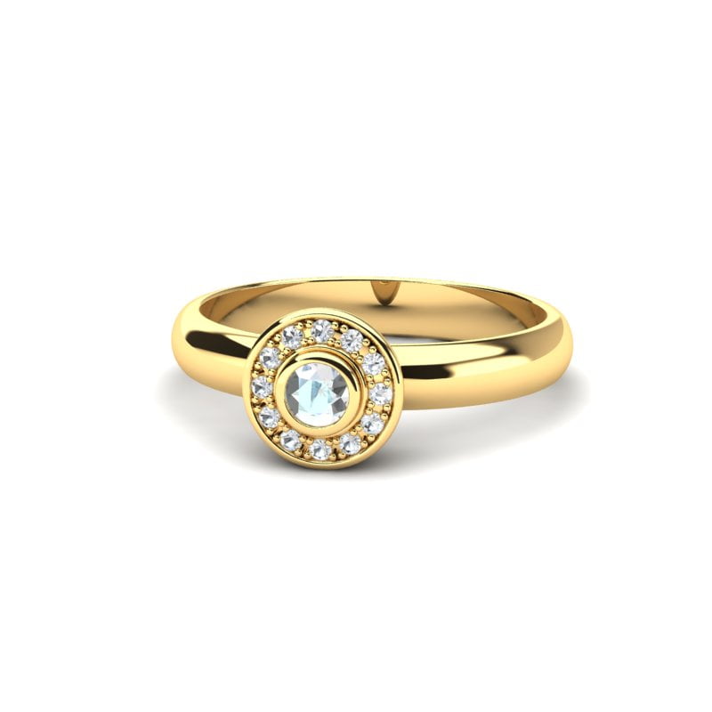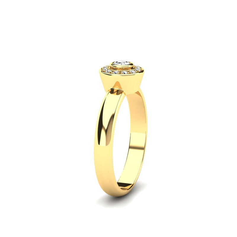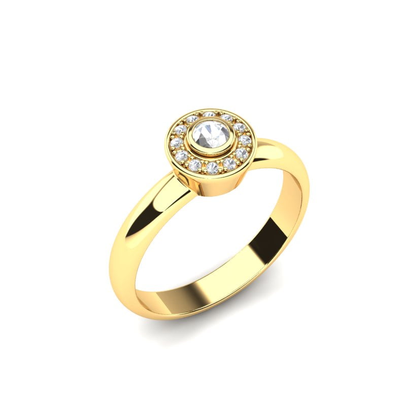 Verenički prsten od žutog zlata odiše elegancijom i suptilnim luksuzom. U njegovom centru dominira blistavi dijamant okruglog brilijantskog reza, postavljen tako da hvata svetlost iz svakog ugla, naglašavajući njegov sjaj i dubinu. Oko centralnog kamena raspoređeni su manji brilijanti u takozvanom „halo“ stilu, koji dodatno pojačavaju sjaj prstena i stvaraju utisak većeg, raskošnijeg dijamanta.