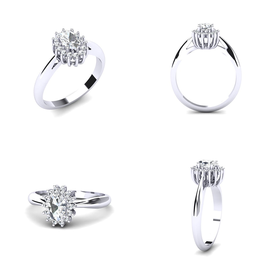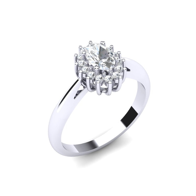 Sitni brilijanti su pažljivo raspoređeni oko centralnog, stvarajući blistav okvir koji dodatno naglašava ovalni kamen. Ovi brilijanti unose dodatni sjaj i dimenziju u dizajn, čineći prsten još raskošnijim i upečatljivijim.