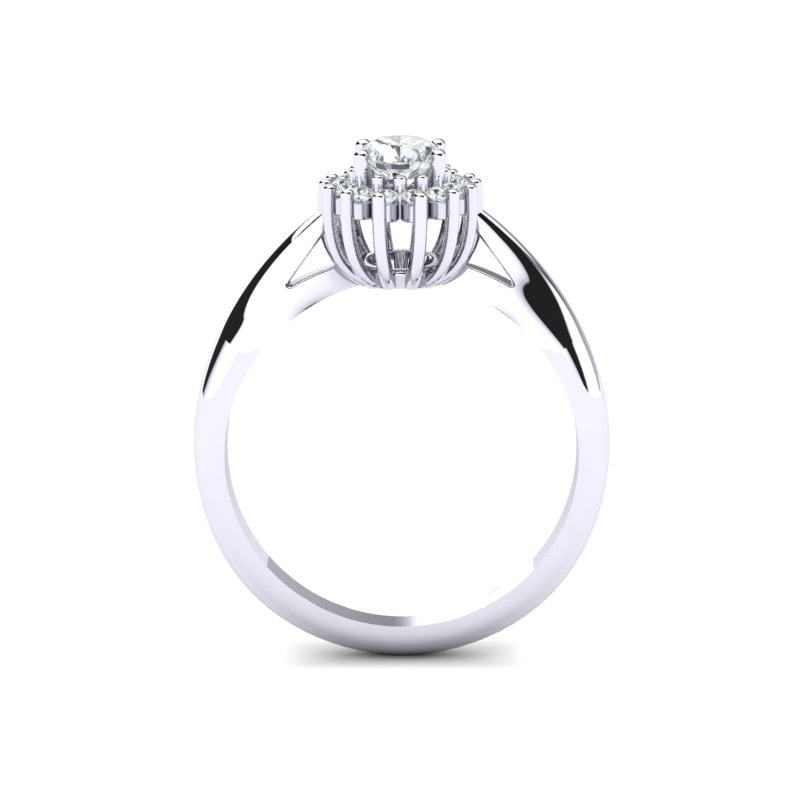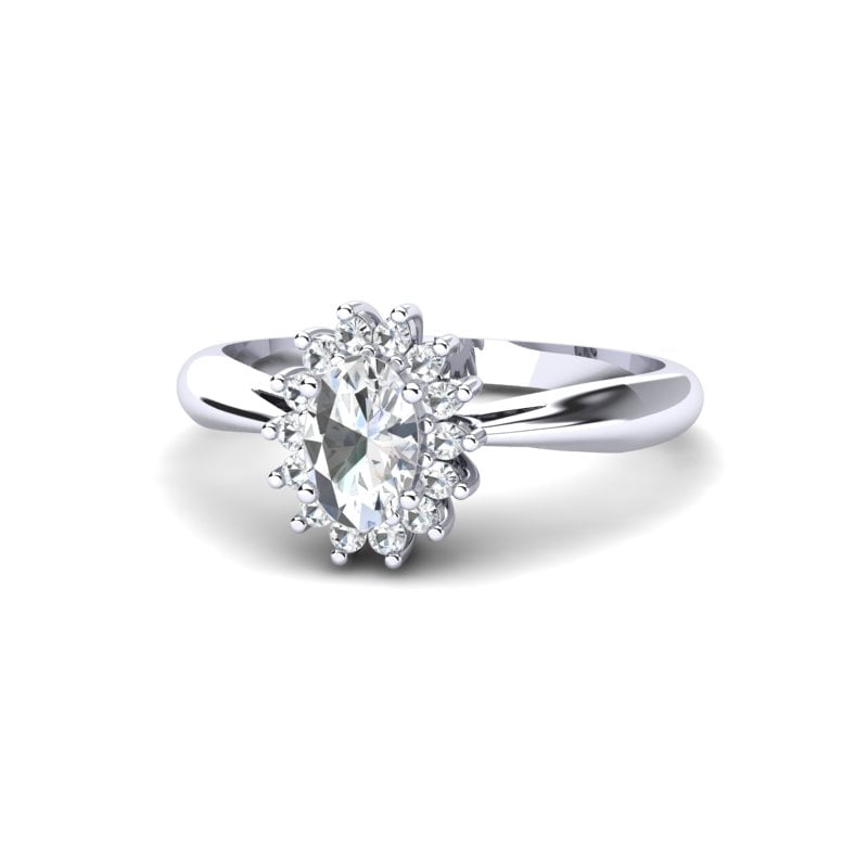 U središtu prstena nalazi se ovalni dijamant, čiji izduženi oblik stvara sofisticiranu i gracioznu siluetu. Ovaj dijamant je poznat po svojoj sposobnosti da maksimalno reflektuje svetlost, pružajući neverovatan sjaj. Njegov oblik dodaje prstenu modernu notu, dok istovremeno zadržava klasičnu lepotu.