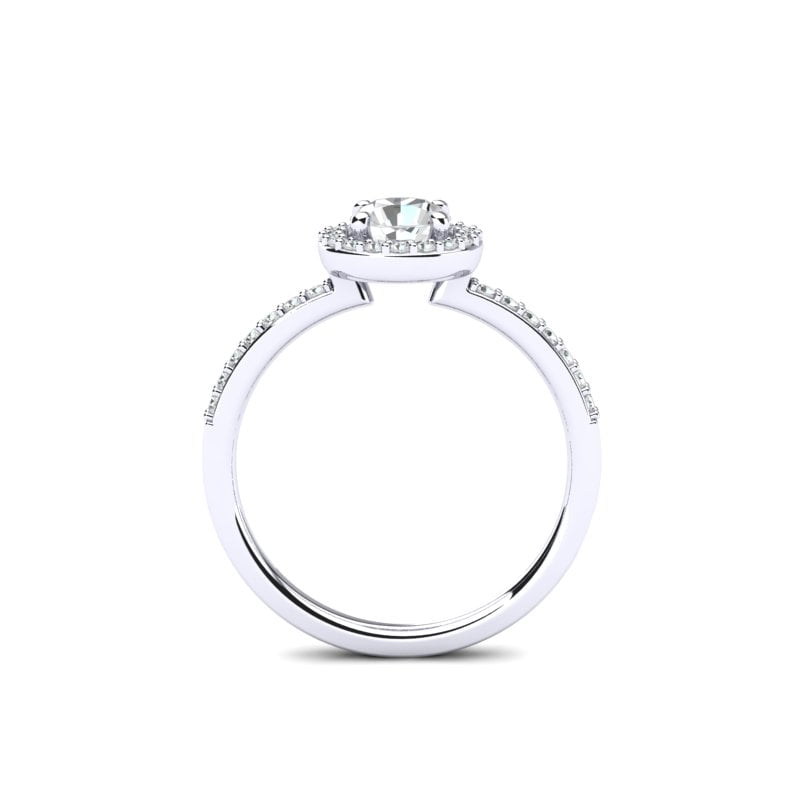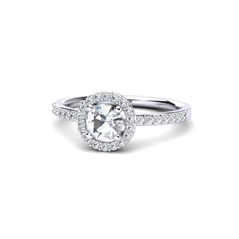 U središtu se nalazi brilijantno brušeni okrugli dijamant — klasičan izbor poznat po svom izuzetnom sjaju i savršenim proporcijama. Halo od sitnih brilijanata dodatno naglašava njegovu veličinu i svetlucavost, stvarajući bogat i elegantan vizuelni efekat.