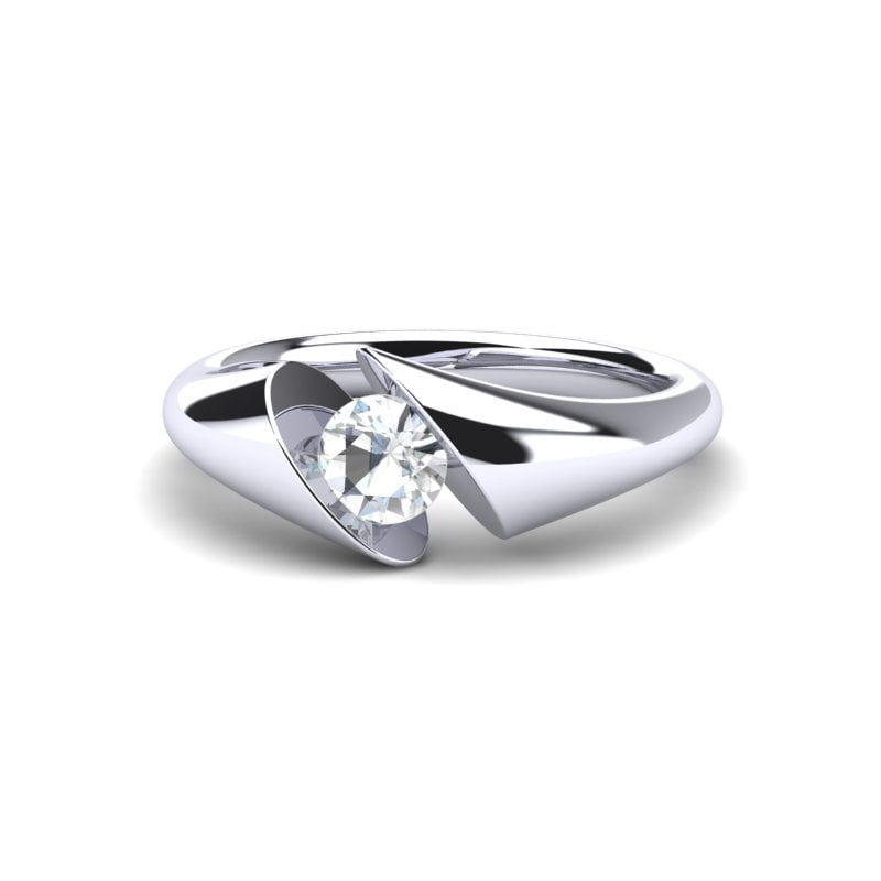 Prsten se ističe svojim neobičnim dizajnom. Šine prstena nežno se savijaju i susreću u neobičnoj, asimetričnoj formi, stvarajući vizuelni tok i dinamiku. U prostoru između tih linija nalazi se centralni brilijant — pažljivo postavljen tako da deluje kao da lebdi, hvatajući svetlost iz svakog ugla.