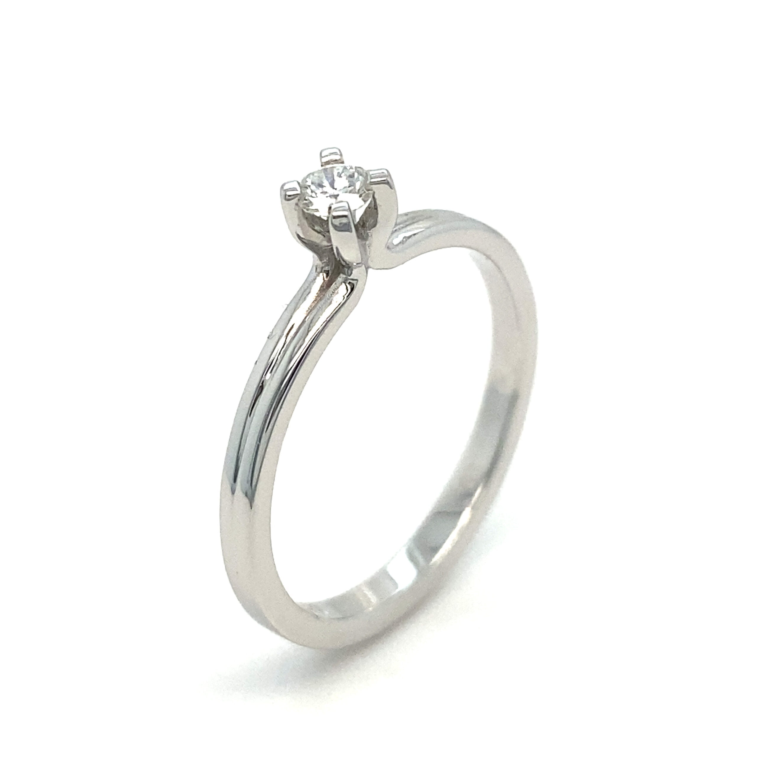 Izrađen od finog belog zlata, ovaj prsten odiše tradicionalnim stilom koji nikada ne izlazi iz mode. U središtu se nalazi brilijant, postavljen u minimalističku postavku sa četiri krapne koje ga sigurno drže. Istovremeno omogućavaju da svetlost neometano prolazi kroz kamen, maksimalno ističući njegov sjaj i čistoću.