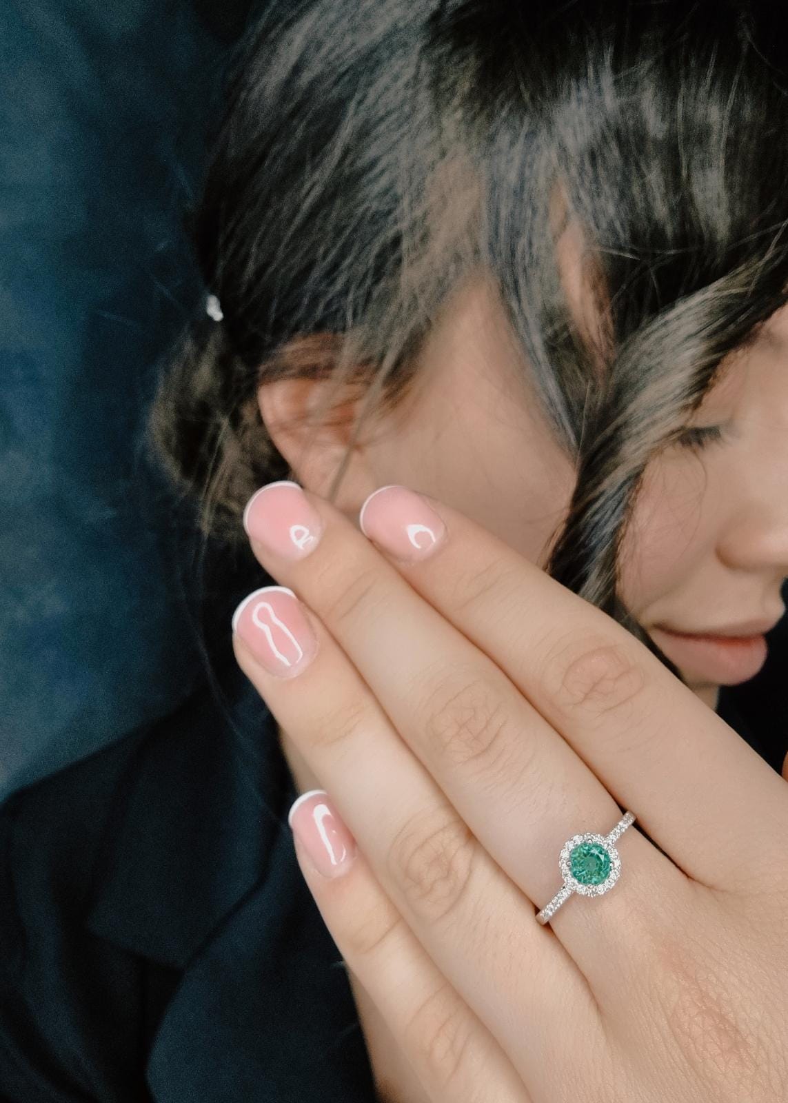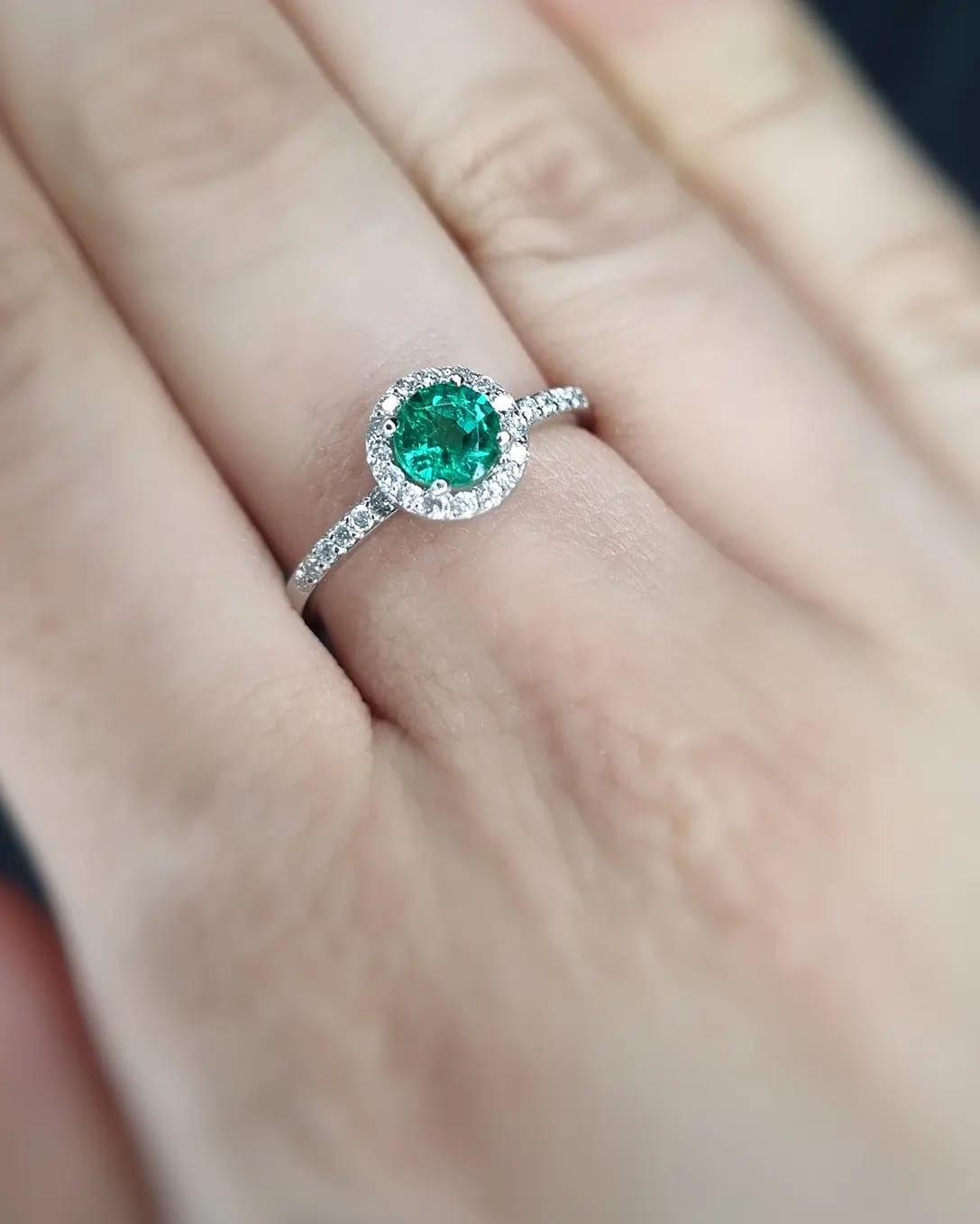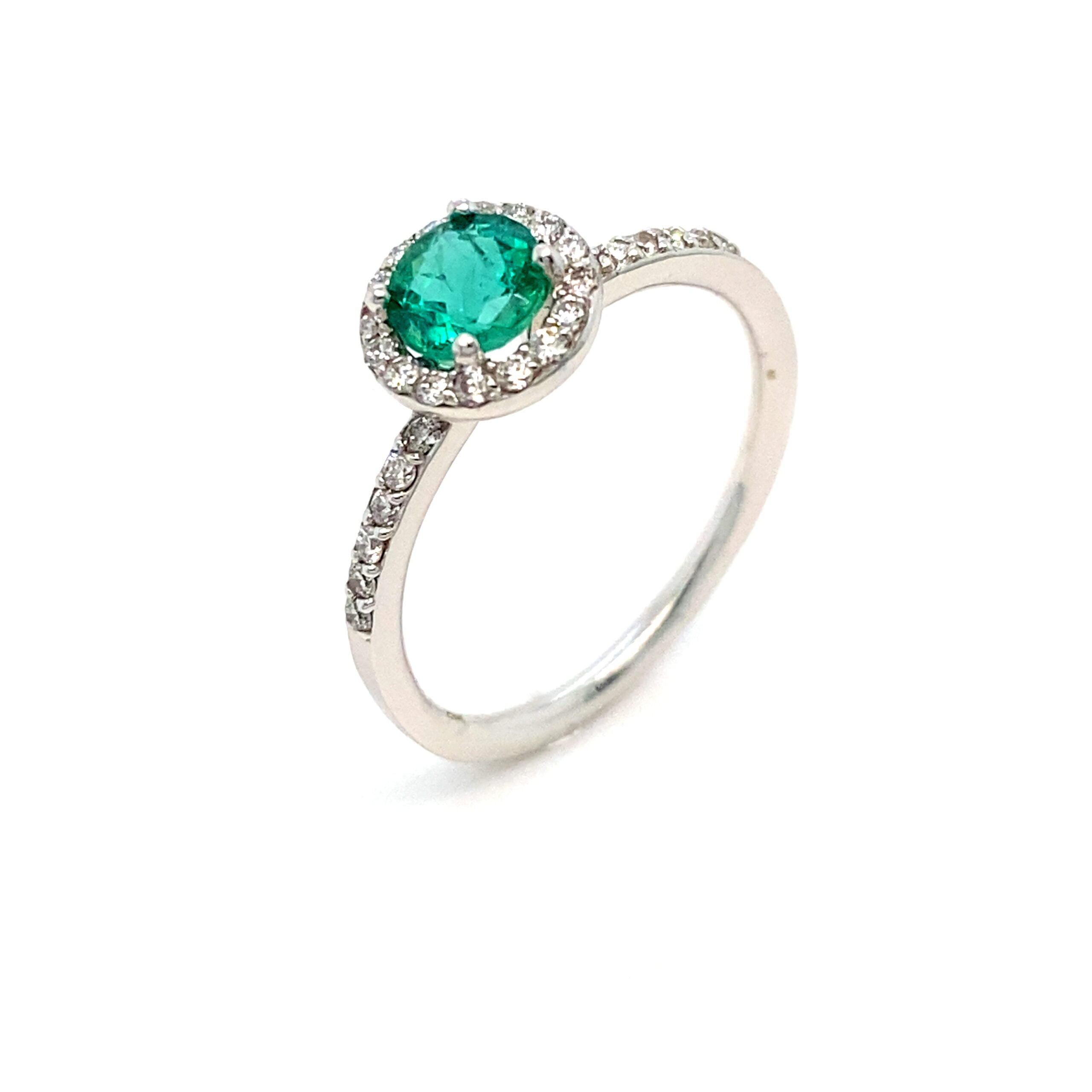 U središtu prstena nalazi se okrugli (round) smaragd, prepoznatljiv po svojoj intenzivnoj zelenoj boji koja simbolizuje ljubav, ravnotežu i novu energiju. Oko njega se nalazi halo od sitnih brilijanata koji dodatno naglašavaju boju i sjaj centralnog kamena, stvarajući efekat svetlosne aure.