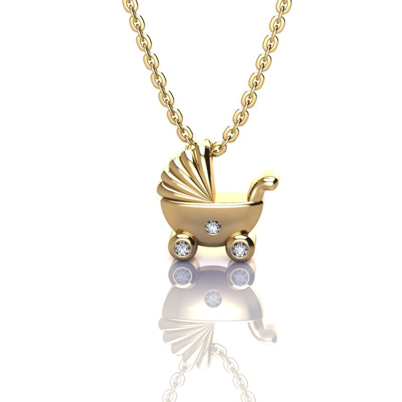 Dečija ogrlica od žutog zlata u obliku kolica za bebe, predstavlja nežan i elegantan komad nakita. Ovaj prelep dizajn simbolizuje početak života i nežnost detinjstva, dok drago kamenje dodaje dašak luksuza. Savršen poklon za posebne trenutke u životu vašeg deteta, koji će trajati zauvek. Model je u ponudi sa dragim kamenjem, brilijantima, rubinima, smaragdima ili safirima. Može se darovati u kompletu sa minđušama ili narukvicom istog dizajna. Darujte nakit neprolazne vrednosti i lepote.
